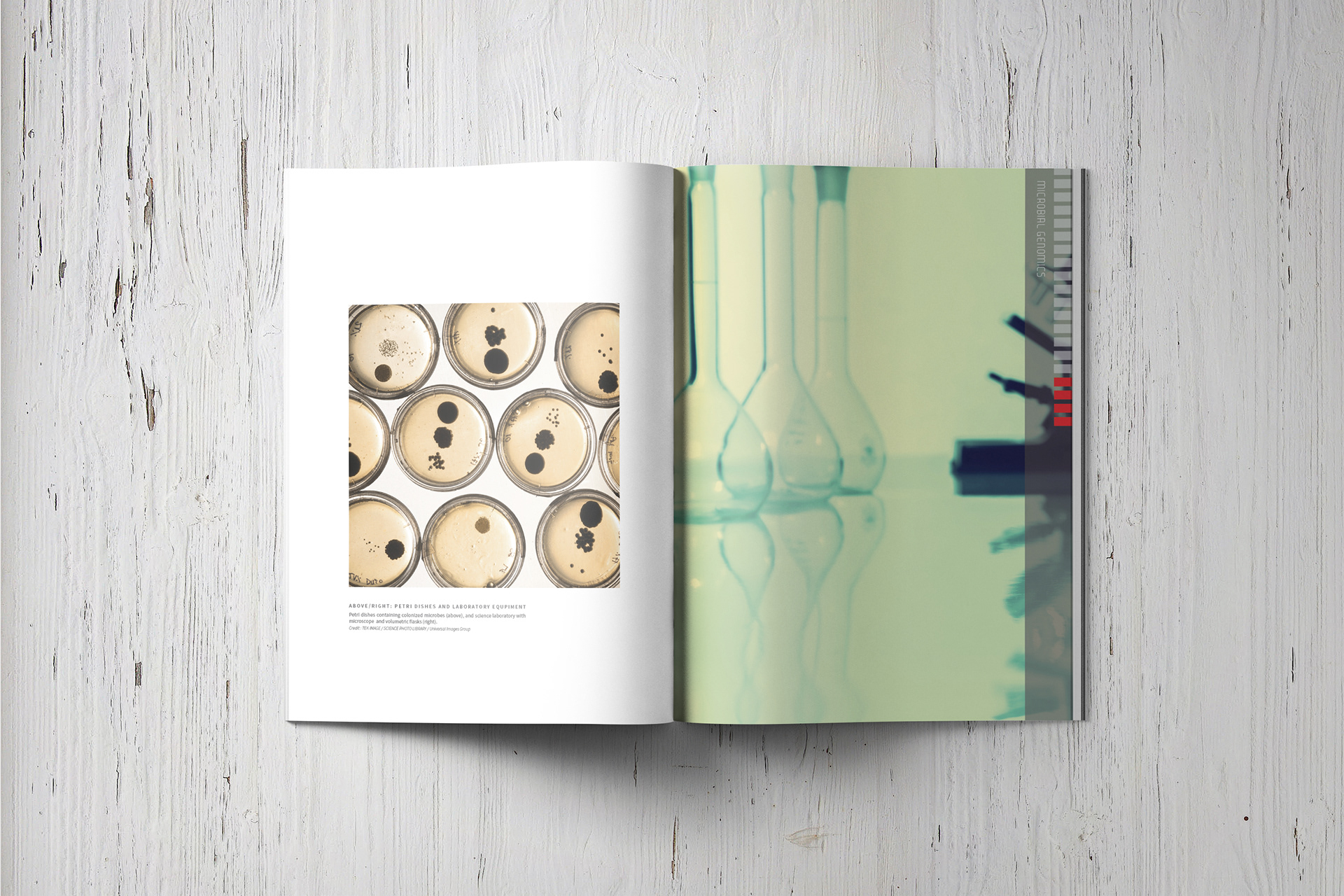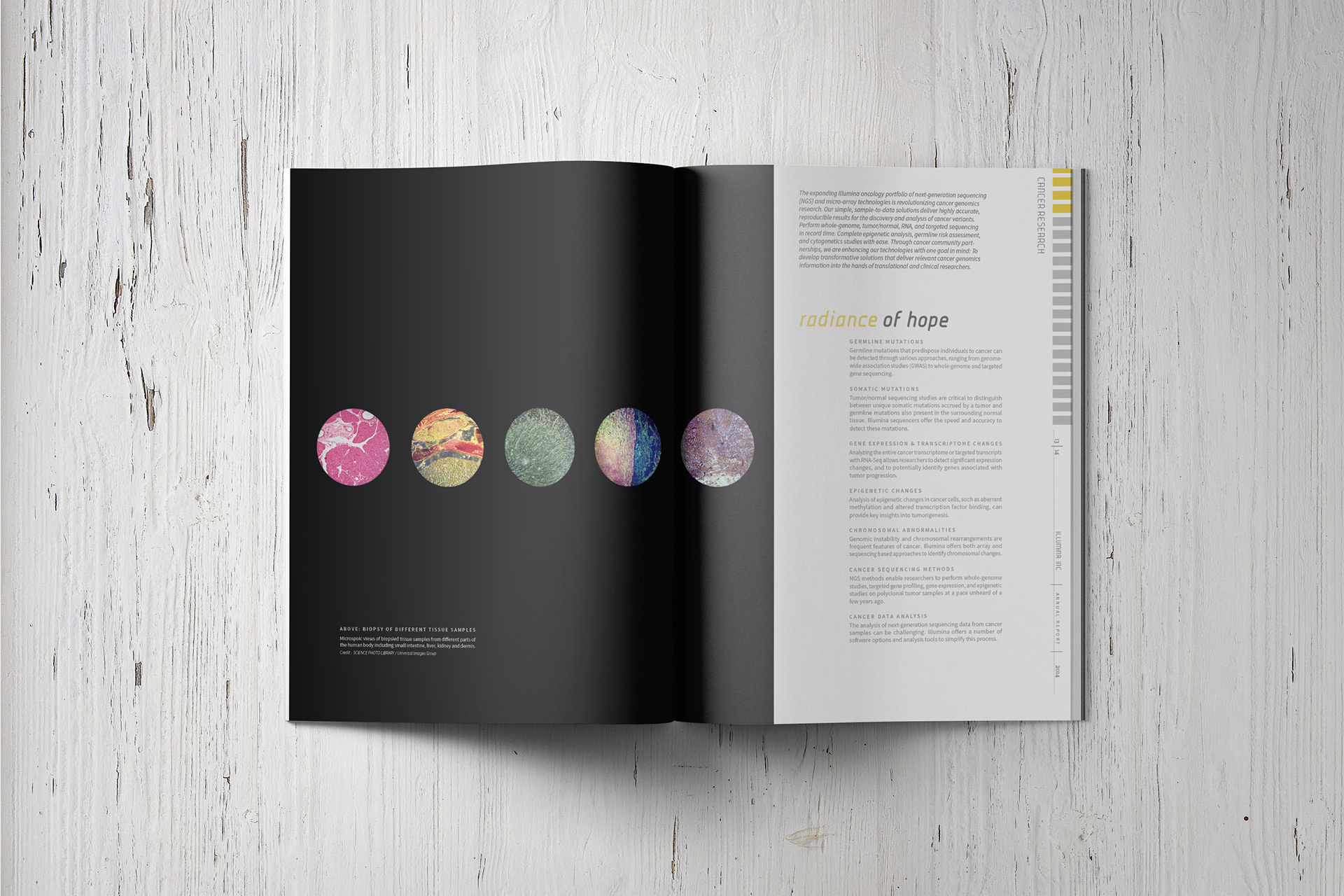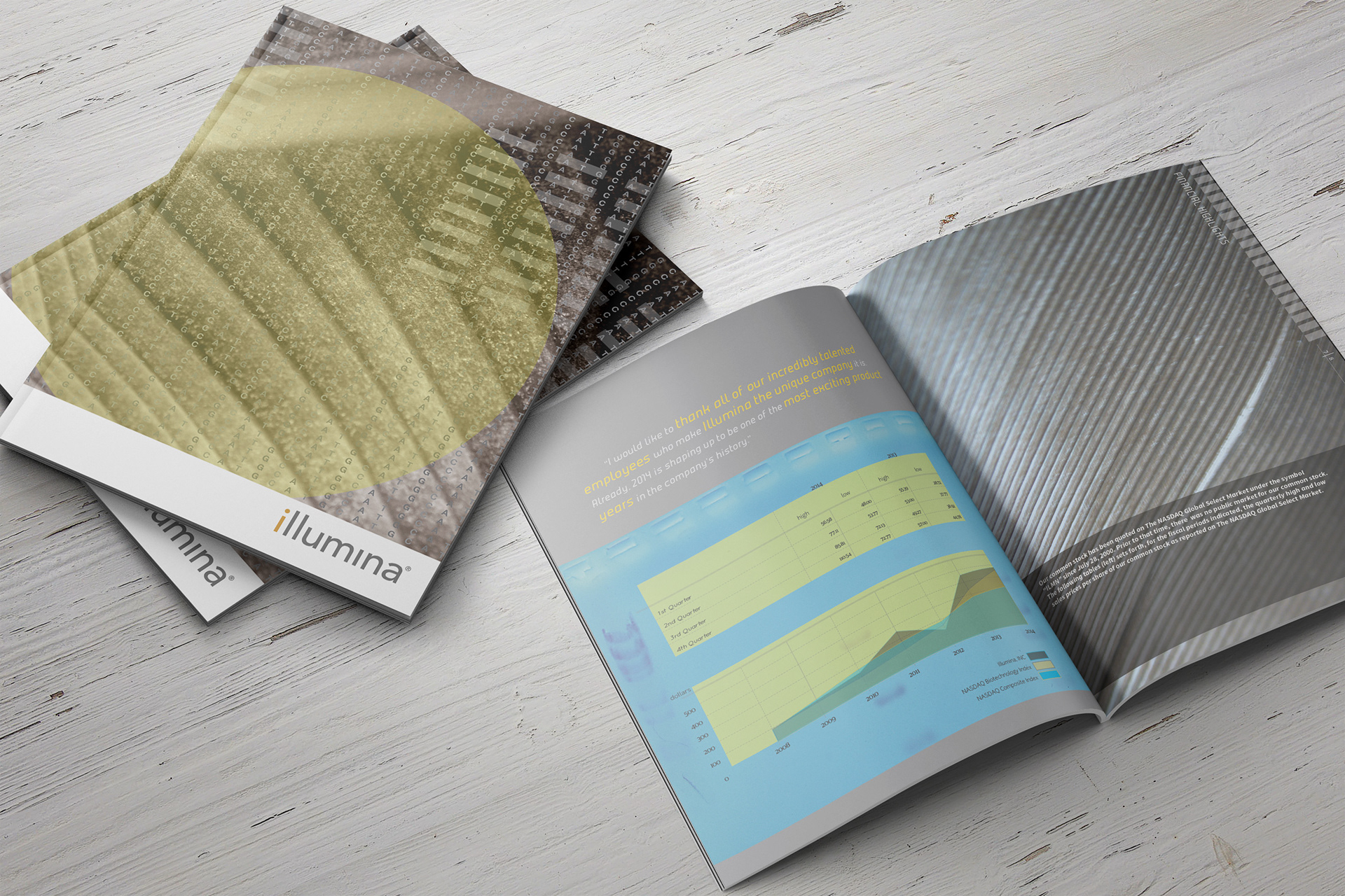 Annual report for ILLUMINA, highlighting all the ways that the research generated from squencing the genome, from cancer research to food production. The challenge was organizing massive amounts of data in a visually appealing and easily digestible way.