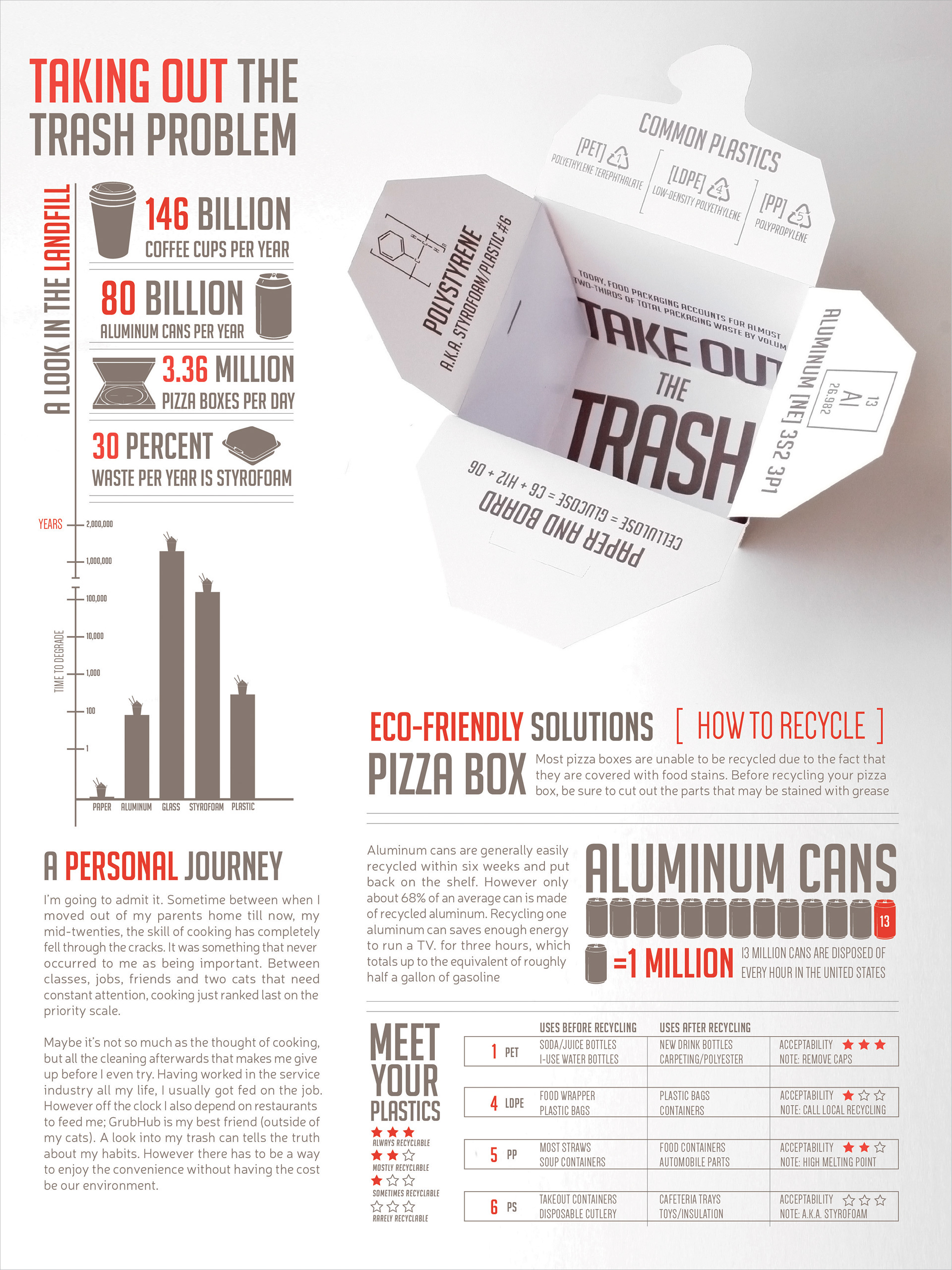 A infographic layout detailing the amount of take-out food waste as well as the types of plastics best for recycling.